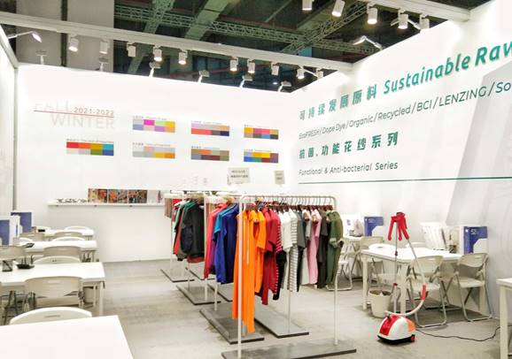 在本次纱线展上,百隆推出了一批具有环保、抗菌、功能性的色纺纱和色纺胚纱系列,如主推的ECOINDIGO、EcoFRESH Yarn、环保系列产品(循环棉、循环涤纶、植物染等各类创新产品)十分契合当下的市场需求;而拥有“颜值和功能”实力的2021-2022秋冬流行色卡产品集更是赢得了客户们的青睐。